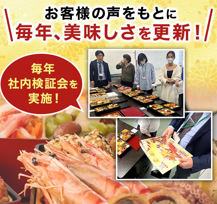 前年度のお客様の声を参考に、社内検証会で試食を繰り返し、献立や盛り付けなどの見直しを行っています。