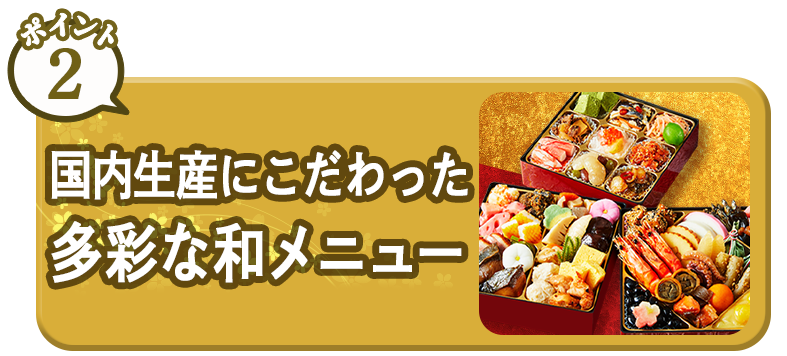 バラエティ豊かでバランスの良いメニューでご家族でも楽しめるおせちです。
