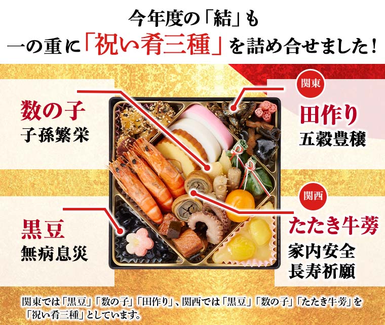 「祝い肴三種」をはじめとした定番献立だけでなく、おせち「結」でしか味わえないオリジナル献立も味わえます。